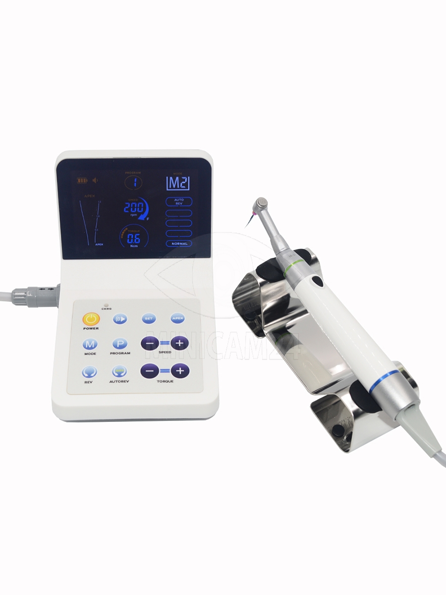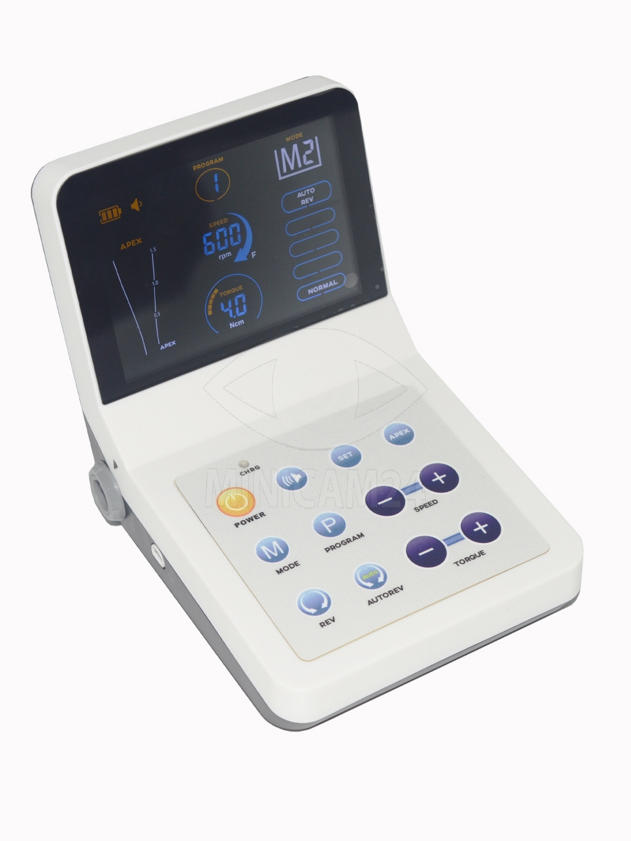 Эндомотор управляется сенсорными элементами и позволяет сохранять до 9 индивидуальных программ. Такое сочетание характеристик делает прибор удобным для точного контроля и настройки параметров при лечении корневых каналов.